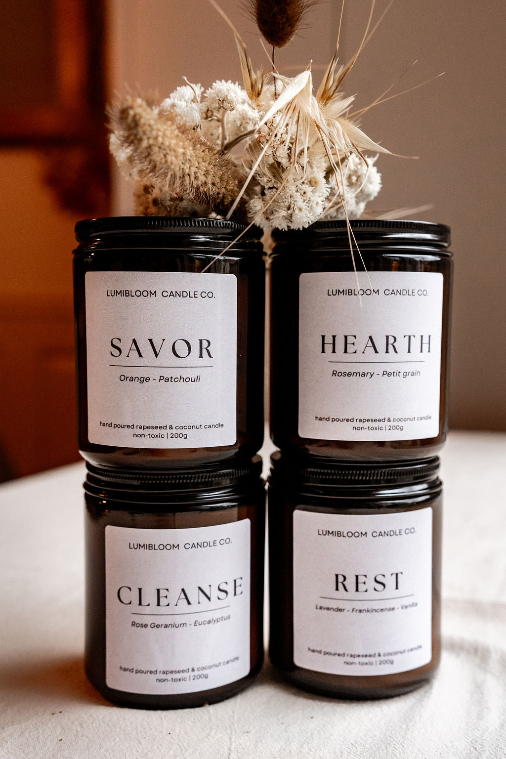 Like the heart of a home, this candle creates a space of warmth and invitation. This candle is a gentle reminder that clarity and calm can exist together. The bright, citrus warmth of bergamot uplifts your spirit, while the fresh, herbal depth of rosemary sharpens focus and invites presence. Petitgrain, with its green and woody notes, grounds the blend, bringing balance to both mind and body. Light this candle when you long for a clear headspace, a softened heart, and a renewed sense of direction. It is perfect for moments of reflection, slow mornings, or whenever you need a calm yet energizing atmosphere. Let its glow guide you back to yourself: steady, focused, and at peace.